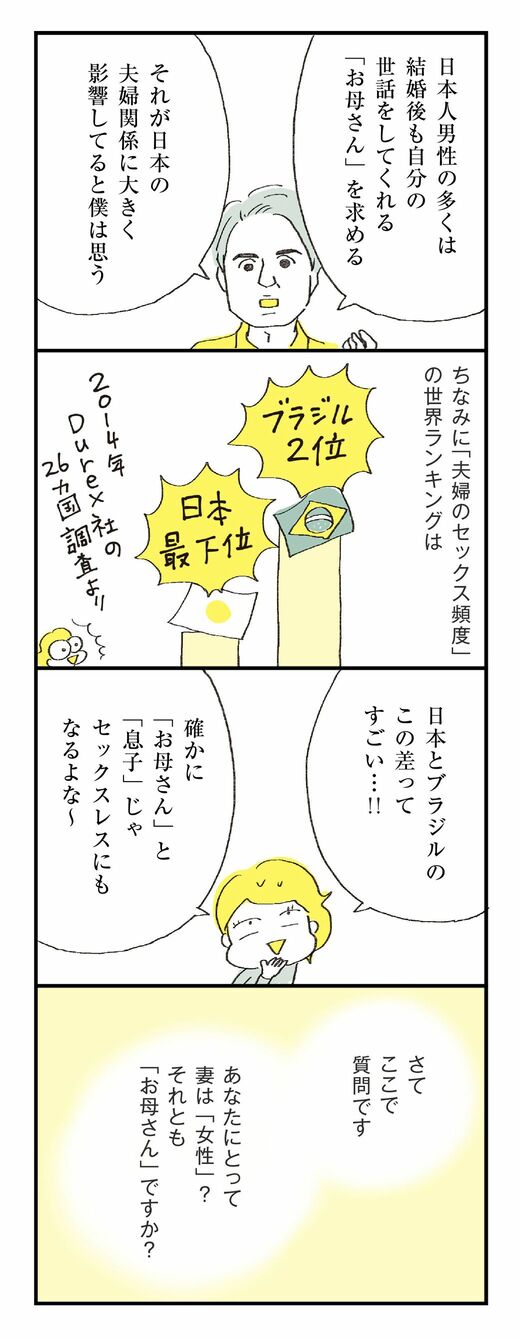ライフ #ほしいのは「つかれない家族」 前の記事 次の記事 妻に「お母さん役」を求める日本の夫が生む断絶 結婚25年でも仲良しの夫婦に秘訣を聞いてみた 4分で読める 公開日時:2022/08/07 10:00 ハラユキ イラストレーター、コミックエッセイスト フォロー 1/9 PAGES 2/9 PAGES 3/9 PAGES 4/9 PAGES 5/9 PAGES 6/9 PAGES 7/9 PAGES 8/9 PAGES あなたにとって妻は「女性」?「お母さん」? 次ページが続きます:【サンバには男性ダンサーも多くいる!】 9/9 PAGES