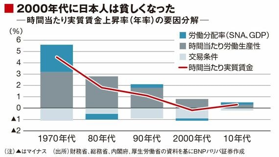 時間当たり実質賃金の変化率は、①時間当たり労働生産性上昇率、②労働分配率の変化率、③交易条件の変化率、の3つに分解できる。このうち、実質賃金の引き上げに不可欠な生産性上昇率は、1980年代は年率2.8%だったが、1990年代は1.8%、2000年代は0.8%、10年代は0.3%と低迷した。