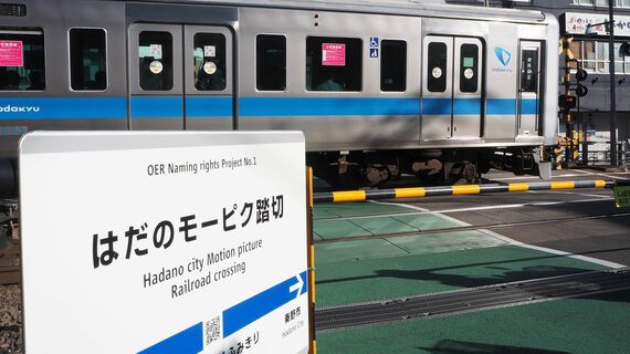 そんな中、小田急電鉄が意外な鉄道施設にネーミングライツを導入する実証実験を行っている。その施設とは「踏切」だ。2022年3月末から、東海大学前駅(神奈川県秦野市)に隣接する「東海大学前1号踏切」に、秦野市の公式動画チャンネルの名前を冠した「はだのモーピク踏切」の愛称をつけ、QRコード付きの看板を設置した。