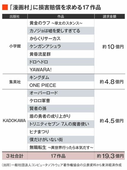 損害賠償額は漫画村のアクセス数から推計した1巻当たりの平均閲覧数と販売価額をかけ合わせて算出。最も請求額が大きいのは『YAWARA!』など7作品が掲載された小学館で約10億円。集英社は『ONE PIECE』など2作品で約4.8億円、KADOKAWAは『ケロロ軍曹』など8作品で約4.5億円を請求する。