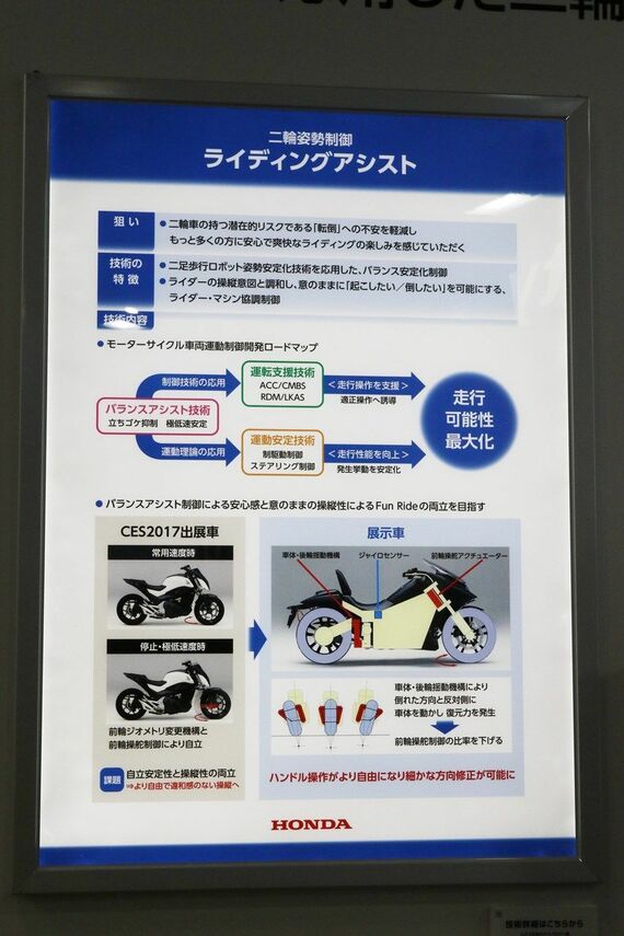 バイクは、バランスを崩すと転倒してしまう乗り物であることはご存じのとおり。ホンダの2輪姿勢制御技術「ライディングアシスト」は、2輪車が持つそうした潜在的リスクへの不安を解消することを目的に開発された。前述のとおり、ホンダが製作したヒューマノイドロボットのアシモなどで培った独自の姿勢安定化技術を応用し、バイクが転倒しやすい停止中や極低速域で車体を安定させるバランス安定化技術だ。