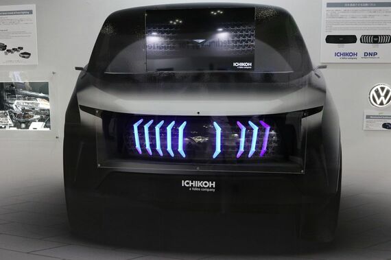 今回展示されたのは、e-グリルのプロトタイプで、アウターレンズ部分に大日本印刷が開発した特殊な加飾フィルムを採用しているのが特徴だ。このフィルムは、意匠性が高い加飾印刷と、必要なときだけ光が透過する光学特性を併わせ持つ。そのため、加飾印刷でグリルに美しいグラフィックの外観を施すことができるだけでなく、装着したライトを点灯させると、グラフィックと独立した自在な光の形状を映し出すことができる。
