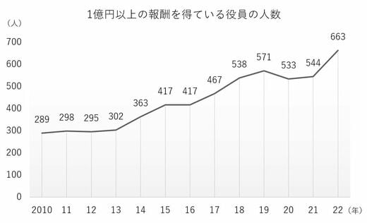 それどころか、役員報酬だけで年間1億円以上の報酬を得る個人も、直近12年間でほぼ一貫して増加し続けている(下図参照)。2010年3月期以降、上場企業は、1億円以上の報酬を得た役員の情報を有価証券報告書に記載することが義務付けられた。ここでは、この情報が開示された時点から現在まで、報酬1億円以上を得ている役員数を集計している。