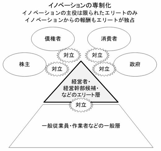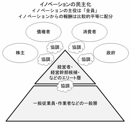実は過去の、日本が輝いていた時期には、主に製造業を中心に、すべての従業員を経営人材に変えるという世界にも類を見ない経営がおこなわれていた。すなわち日本の優良企業においては、すべての従業員を経営人材として扱う「イノベーションの民主化」(下図)が起きていたのである。