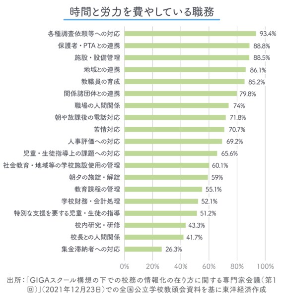 この調査でもトップに挙がっているが、各種調査でとくに負担が重い業務としてよく挙がるのが、教育委員会などから求められる事務手続きや調査への対応だ。