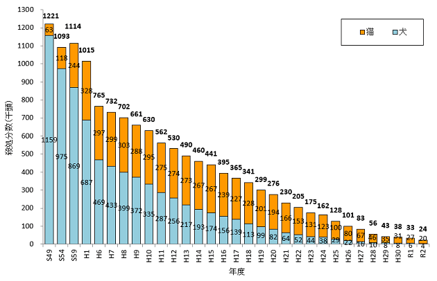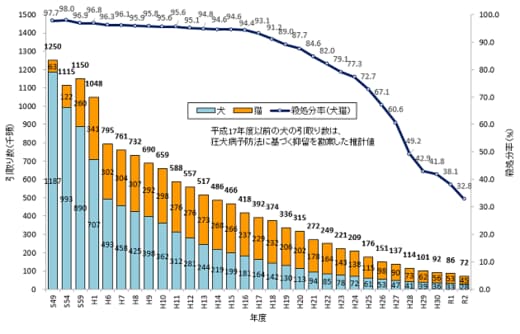 令和2年(2020年)度(令和2年4月1日~令和3年3月31日)に全国の保健所などで殺処分された犬猫は、昭和49年以降で最小の2万3764匹だったと環境省が公表しています。