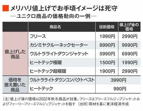 カジュアルな定番商品が主軸のユニクロは、それだけ価格の変化が目に付きやすい。ファストリの広報担当者は、「人気商品や、数量が多く売れる商品はなるべく値上げしない方針」と説明する。