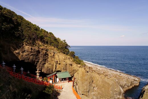 多くの神社は参道を上っていくが、鵜戸神宮は、海岸に面した参道を岩に打ち寄せる波を眺めながら下っていく。本殿の脇、下を見てみると亀の姿に似た石がある。「霊石亀石」といい、トヨタマビメが乗ってきたと伝えられている。亀の背のくぼみに「運玉」を投げ入れ、入ると願いが叶うという。海を眺めながら下りる参道で海神の娘に思いをはせた。