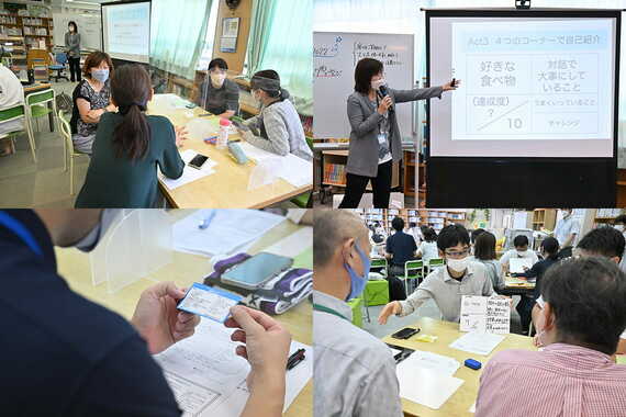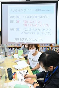 横山氏の導きに沿ってファシリテーター役がインタビュアーとなり、サイドワーカーに「1学期を振り返って」「よかったこと」「困っていること」「これからどうしたい?」について聞きながらホワイトボードに書き、質問やアドバイスをしながら対話を重ねた。初対面でありながら、「同じ区内の教員」という共通項が良好なコミュニケーションを生み出し、会場全体が安心感に包まれている。
