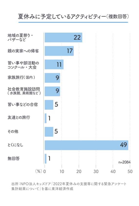 こうした困窮家庭の子どもたちは、夏休みをどのように過ごしたのか。調査では、夏休みに予定しているアクティビティーについても聞いているが、「とくになし」が49%だった。もちろん、コロナ禍で旅行などを控えている可能性はあるだろう。だが、困窮家庭の子どもたちは、経済的な理由で教育だけでなく、多様な経験をする機会が不足しがちだといわれる。