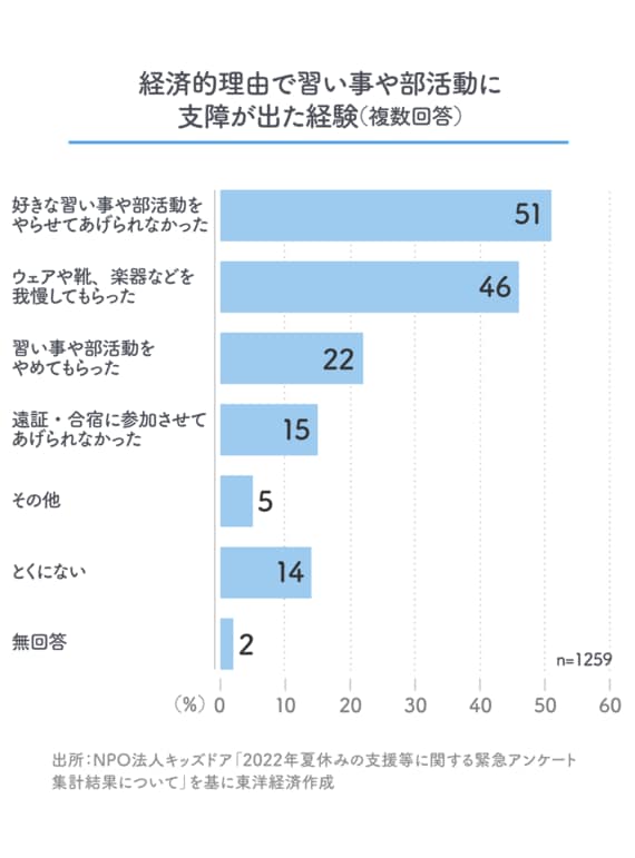 実際、経済的な理由で習い事や部活動に支障が出た経験についても聞いており、「好きな習い事や部活動をやらせてあげられなかった」が51%で最多で、「ウェアや靴、楽器などを我慢してもらった」が46%、「習い事や部活動をやめてもらった」22%、「遠征・合宿に参加させてあげられなかった」15%だった。