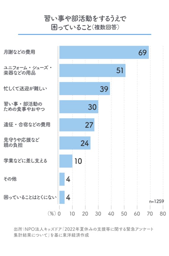調査では、習い事や部活動で保護者が困っていることも聞いているが、「月謝などの費用」が69%で最も多く、「ユニフォーム・シューズ・楽器などの用品」が51%、「習い事・部活動のための食事やおやつ」が30%、 「遠征・合宿などの費用」が27%と費用に関する項目の数字が高かった。