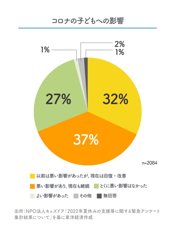 だが、休校中やその後についても、家庭内や塾などからフォローが得づらい困窮家庭では、学校の勉強だけで学びの遅れを取り戻すことが難しかった可能性がある。また前出のキッズドアの調査では、コロナによる子どもへの影響について、全体の7割が悪い影響があったと回答しており、「悪い影響があり、現在も継続」が37%もいることからも、コロナの影響が長期化していることがわかる。