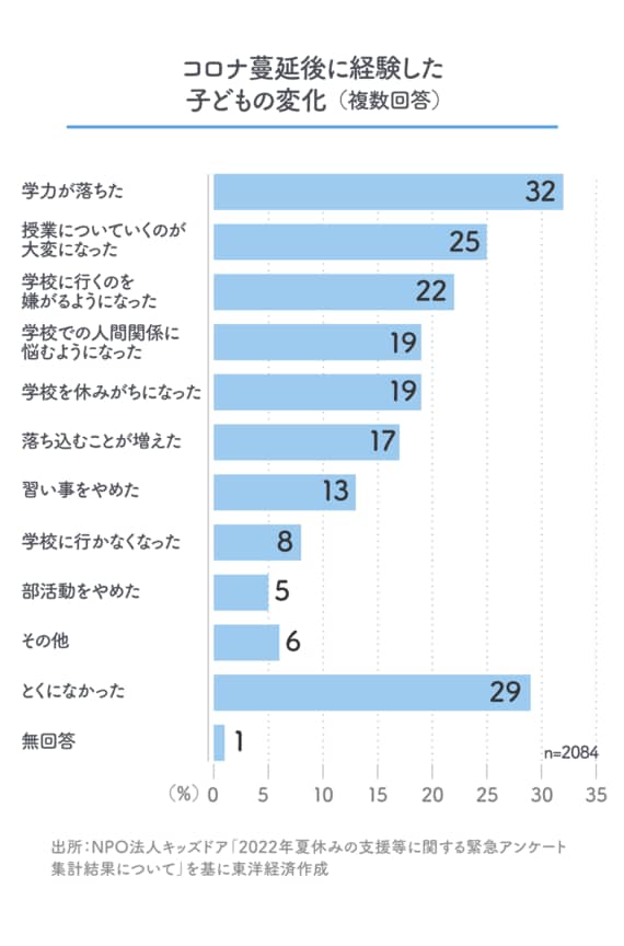 調査では、コロナによる子どもへの影響も聞いている。最も多い回答は「学力が落ちた」32%に続き、「授業についていくのが大変になった」が25%、「学校に行くのを嫌がるようになった」が22%だった。「学校を休みがちになった」(19%)、「学校に行かなくなった」(8%)という回答もあり、不登校なども心配される。