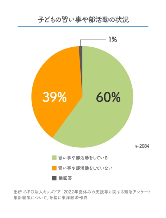 その傾向は、子どもの習い事や部活動の状況について聞いた項目からもわかる。今の子どもは忙しく「1週間のうち習い事がない日はない」という子も珍しくないが、困窮家庭では「(塾を含む)習い事や部活動をしていない」が39%だった。