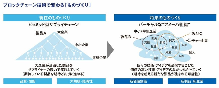 現在のものづくりは、ピラミッド型サプライチェーンを基盤にしている。大企業が企画した製品をサプライヤーの協力で実現していく仕組みにより、品質・性能を一定の水準に保ち、大規模かつ効率的な製造と経済性を担保できるわけだ。