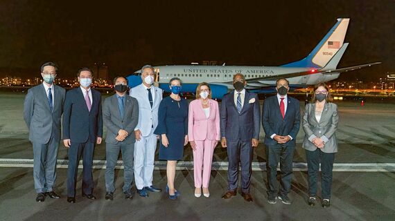 8月2日夜、台湾に専用機で到着したペロシ米下院議長(右から4人目)ら。翌日には台湾を離れた(提供:TAIWAN'S MINISTRY OF FOREIGN AFFAIRS(MOFA)/AFP/アフロ)