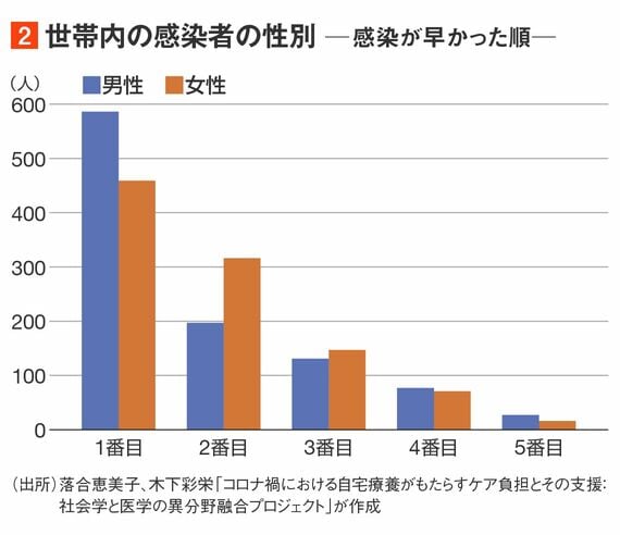 感染の順序を見ると、1番目は男性、2番目は女性が多い(図2)。もちろん外で感染した人を責めるわけではないが、少なくとも調査時点までは、男性がウイルスを家に持ち帰り、それを女性にうつしてしまうパターンが多かったようだ。
