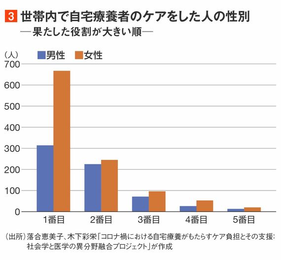 自宅療養者の「看病や身の回りの世話」(以下ではケアと呼ぼう)のもっとも中心的役割を担ったのは、女性が男性の倍以上だ(図3)。自宅療養者のケアをしながら感染を防ぐのは難しいだろう。