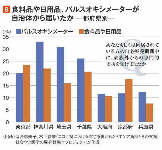 とはいうものの、頼みの綱の行政からの支給は、世帯形態にかかわらず15%ほどにしか届いていない。食料品や日用品、パルスオキシメーターが届いた割合は自治体によって差があり、関東と関西では「東高西低」だったといえそうだ(図8)。