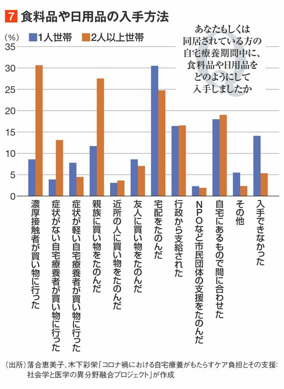 しかし「食料品や日用品の入手方法」を尋ねると、あってはならないはずの回答が並んだ(図7)。「濃厚接触者が買物に行った」「症状がない自宅療養者が買物に行った」「症状が軽い自宅療養者が買物に行った」などである。