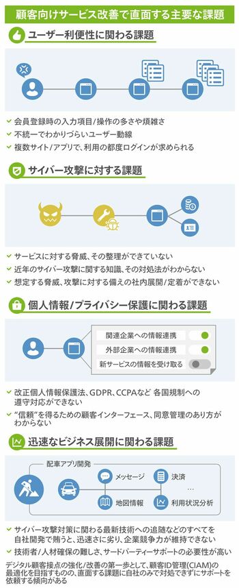 この「攻め」と「守り」を両立させる際に重要なのが、顧客IDや属性情報を適切に管理して、正しい認証・認可を提供することで顧客に安心・安全を届けるCIAM(Customer Identity and Access Management)の観点である。企業の資産(リソース)を正しく識別し、効果的に活⽤、運⽤するためにはこの観点の重要性を認識することが欠かせない。これを整備しようとする企業の多くが抱えている課題は、大きく分けて4つある。