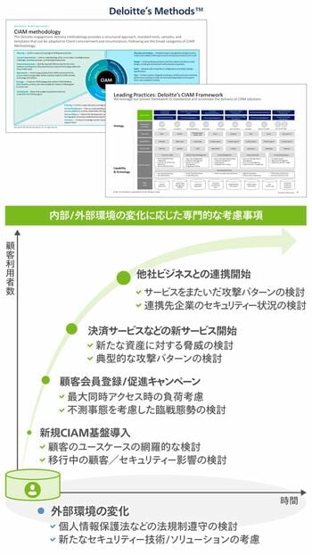 ビジネスを拡大、展開するに当たってCIAMを最適化したいが、自社にノウハウがない――。そうした悩みを持つ企業を多数サポートしているのが、デロイト トーマツ サイバーのCIAMサービスである。具体的には、顧客ID基盤、機能の構想策定や不正検知対策の構想検討、その後の設計、構築プロジェクトの推進支援まで幅広くサポートする。クライアントのビジネスモデルはBtoC、BtoB、GtoC、BtoBtoXなどさまざまだが、櫻田氏は「顧客ID基盤や不正検知対策は一度導入、構築すると後戻りが難しく、投資額も大きいため、当方のような専門家にご相談いただくケースが多いですね」と共通点を明かす。