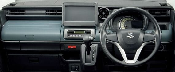 インテリアを見てみよう。インストルメントパネルの形状や機能は既存のスペーシアシリーズと共通だが、パネルカラーをグレーイッシュブルーとすることで、外観と同様に道具感を演出している。この差し色は、ドアポケットやクォーターポケットにも使われ、インテリアを印象づける。