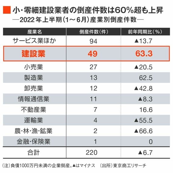 気がかりなのは、建設業で小・零細の倒産が増えていることだ。下図を見て欲しい。東京商工リサーチの「負債1000万円未満の倒産」調査によると、2022年上半期(1~6月)の産業別倒産件数は建設業が49件と、飲食店を含むサービス業ほかに次いで多かった。しかも、前年同期比で建設業は63.3%増と、大きく増えた。
