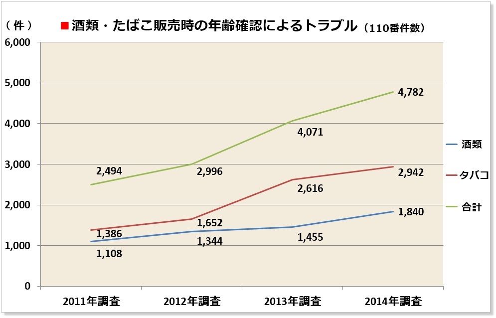 コンビニでの、酒類・たばこ販売時の年齢確認によるトラブルは年々増加している(出典:コンビニエンスストアセーフティステーション活動リポートより/著者作成)