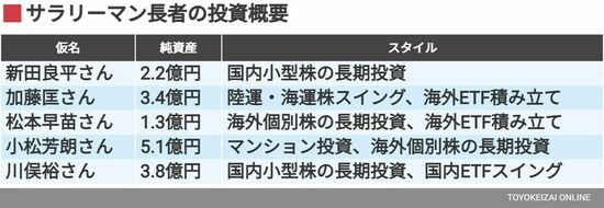 まずインタビューした5人のサラリーマン長者の投資の概要をまとめると、以下の通りです。