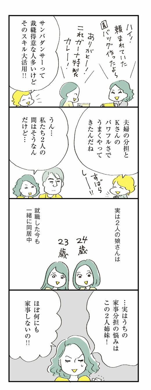 ライフ #ほしいのは「つかれない家族」 前の記事 次の記事 成人した娘2人が「安住する実家」の妻がボヤくこと 結婚25年、夫婦二人三脚の思わぬ副産物 3分で読める 公開日時:2022/09/04 09:00 ハラユキ イラストレーター、コミックエッセイスト フォロー 1/9 PAGES 2/9 PAGES 3/9 PAGES 4/9 PAGES 夫婦の分担はうまくいったけれど 次ページが続きます:【まるで「昭和のお父さん」な娘たち】 5/9 PAGES 6/9 PAGES 7/9 PAGES 8/9 PAGES 9/9 PAGES