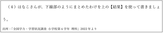 これは、一つには実験結果を分析し、説明させる学習過程に甘さがあることを示している。とくに理科の実験を説明する際に、数値がない述べ方では説明になりえていないという指導が、普段の授業で十分にされていないこととかかわる。