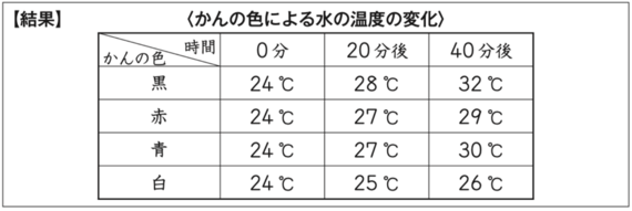 はなこさんは、上記の【結果】から、「はね返した日光を水の入ったかんにあてると、黒色のかんの水の温度が最も高くなる」とまとめている。そのうえで次の設問が続く。