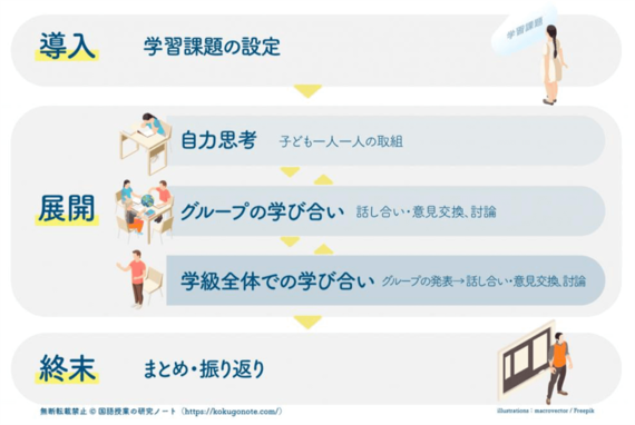 秋田県では、グループの対話を生かした授業を「探究型授業」と呼び、多くの小・中学校で実践している。探究型授業では、次のような形で授業を展開することが多い。