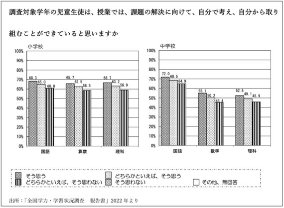 文科省と国立教育政策研究所が今回の調査についてまとめた「全国学力・学習状況調査報告書」には、質問紙の結果と正答率のクロス分析が載っている。それを見ると課題解決型、対話型の授業を受けている子どものほうが全体として正答率が高い。