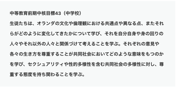 オランダでは2012年に性教育が義務化となり、特殊教育を含むすべての教育において、初等教育(小学校)から20歳まで性教育を学ぶことが義務づけられました。日本の「学習指導要領」のように、オランダにも「中核目標」という教育において学ぶべき内容をまとめた指針があり、その中で性教育に関する目標が定められたのです。