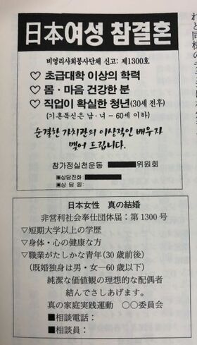 チラシには「日本女性 真の結婚」とあり、「短期大学以上の学歴」「心身・心の健康な方」「職業がたしかな青年」と書いてあります。その下には「純潔な価値観の理想的な配偶者 結んでさしあげます」とあります。