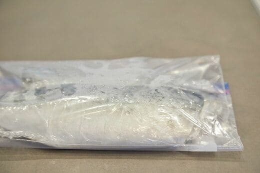 酢で〆た「しめさば」をラップでくるみ、冷凍庫へ。大切なことなので2度言いますが、マイナス20℃で24時間以上冷凍してください。