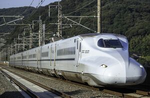 熊本から乗った「さくら546号」は、山陽・九州両新幹線直通仕様8両編成のN700系。先頭形状は東海道・山陽新幹線の16両編成仕様と同じだが、有田の磁器をモチーフという青磁色や金帯がローカル色を出している。