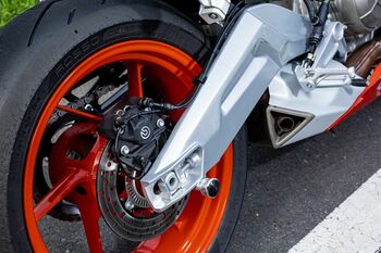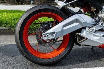 また、一体鋳造で作られたスイングアーム単体は、フレームではなくエンジンに直接付けることで、最適なトラクションとホイールベース短縮に成功している。先に触れたコーナリングフォースの高さに加え、一方では直進安定性にも優れており、ライダーに不必要な負担がかかることも少なく感じた。