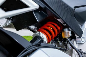 カヤバ製のサスペンションは、このクラスとしては標準的な減衰性能を出しており、前後ともにアジャスタブルだ。オーナーの好みで、さらにハイスピードセットも可能。実際に高速道路の継ぎ目ではしなやかにギャップを吸収しており、ショートホイールベースながらもバランスがよいと感じられた。