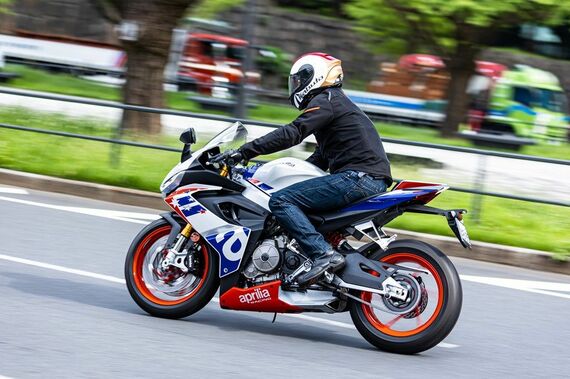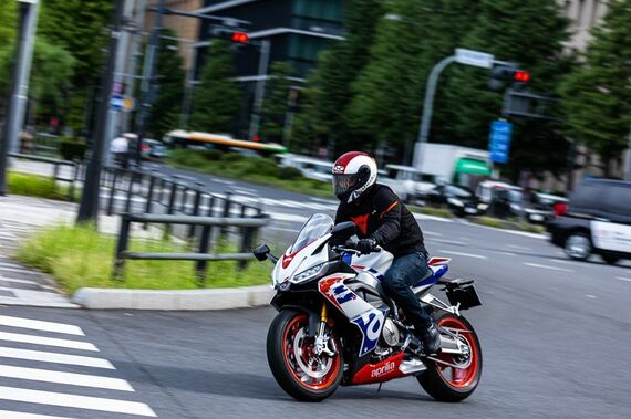 このRS660のコーナリングフォースは特筆もので、ブレーキングからフロントレバーをリリースしながら寝かし込む1次旋回は理想的であった。つまり、ライダーが予測したどおりにライントレースをしていく様は、まるで超一流のレーシングマシンの動きを思い出させてくれるほど、コーナーへの飛び込みが面白い。もちろん、前段でもあるフルブレーキングの安定感も高く、ブレーキングゾーンから1次旋回〜2次旋回〜脱出という一連の流れが、前後に奢られたタイヤ「ピレリ・ディアブロ・ロッソコルサⅡ」のグリップ力とあわせてドラマティックに演出されている。