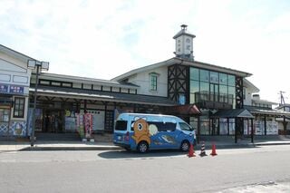 こちらは、駅前に乗り入れているもう1本の路線バスである、岩手県北バスの久慈海岸線久慈駅行きで三崎半島を回る。見た目はふつうの路線バスだが「市民バス」のステッカーが貼ってあり、久慈市が運行を委託しているバスとわかる。