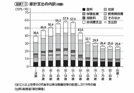 図表1‒3は、総務省「家計調査」から、二人以上世帯の一月当たりの平均支出額を年齢階級別に取ったものである。64歳までは勤労世帯の家計収支を、65歳以降は無職世帯の家計収支を取ることで、65歳で引退すると仮定した生涯の家計支出の全体像を分析していく。