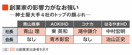 洋服の青山、AOKI、コナカ、はるやま――。国内の紳士服4大チェーンは、それぞれ創業者の名前から店の屋号が付けられている。4社とも社長や会長に創業家出身者が君臨し、上位株主にも創業家一族や創業家の資産管理会社が名を連ねる。