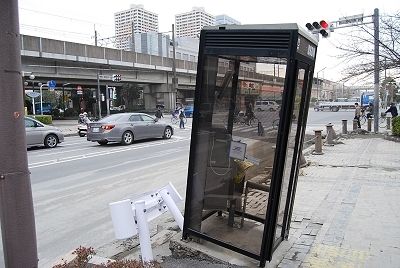 (6)傾いた公衆電話ボックス。奥にみえるのが新浦安駅