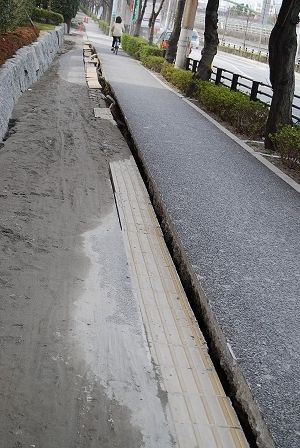 (2)点字ブロックを境目にして裂け目。左が順天堂大浦安病院