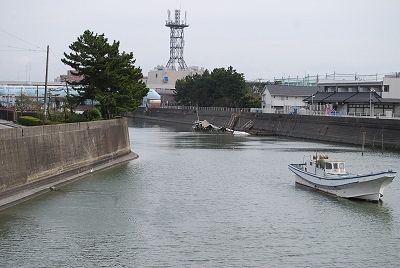 市役所に向かうため境川を超える際、下流方向を見ると、船着場が壊れていた。今回の地震によるものだろうか(4)。