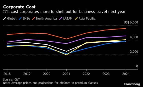 CWTと業界団体グローバルビジネストラベル協会(GBTA)によれば、ビジネスクラスの運賃は今年45%、来年さらに6.2%の上昇が見込まれている。